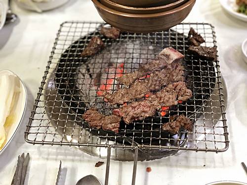 숯불에 구운 갈비를 게눈 감추듯 먹고 나면 구수한 시래기된장찌개와 매운갈비찜이 서비스로 나옵니다. 숯불에 올려놓고 태워버리거나 질겨서 못 먹는 갈빗대에 붙은 고기만 떼어다가 매운갈비찜으로 만들어주는데 그 맛이 일품입니다.