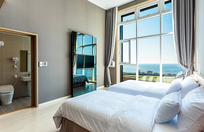 캠핑 갔다가 바람이 너무 쎄서 급하게 잡은 숙소였는데 객실 전체적인 분위기가 차분하고 깔끔했어요. 욕실도 생각보다 크고 욕조가 있어서 반식욕도 가능합니다. 냉장고가 크고 테라스도 넓어서 시원한 맥주 쟁여두고 씨뷰 테레스에서 멋진 풍경을 볼 수 있어요. 해변이랑 가깝고 바로앞 편의점이랑 레스토랑들도 있어서 늘어지는 휴가 보내기에 최적입니다!!!